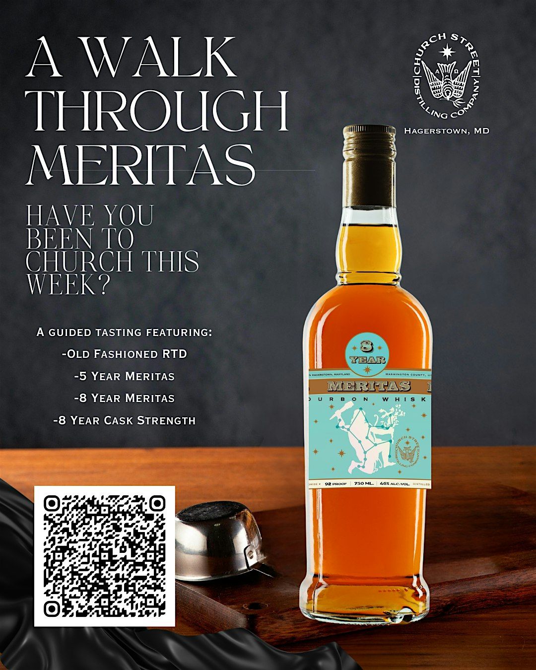 Celebrate our new 8 year bourbon release with a whiskey tasting experience! Be the first to try our cask strength 8 Year Meritas, our bourbon whiskey, led by Church Street Head Distiller Stuart Henderson