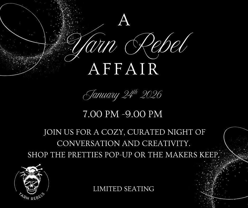 A Yarn Rebel Affair offers a full day of inspiration for makers ready to deepen their craft. In the morning, join Megan of Pip & Pin for Sweaters That Fit, a workshop designed to help knitters achieve garments they’ll truly love to wear. You’ll learn how to take accurate measurements, understand ease, swatch with intention, and choose patterns that set you up for success. Together, we’ll explore sweater styles, sizing, and practical tips, with time for Q&A and troubleshooting common issues. You’ll leave with your own measurements, a reusable printed resource, and fresh confidence for your next cast‑on. As evening falls, the rebels gather for an elegant night of making, mingling, and meaningful connections. Bring a project, share stories, and enjoy curated shopping with Campfiber Yarns, Studio Britta, and a private after‑hours shop at The Makers Keep.