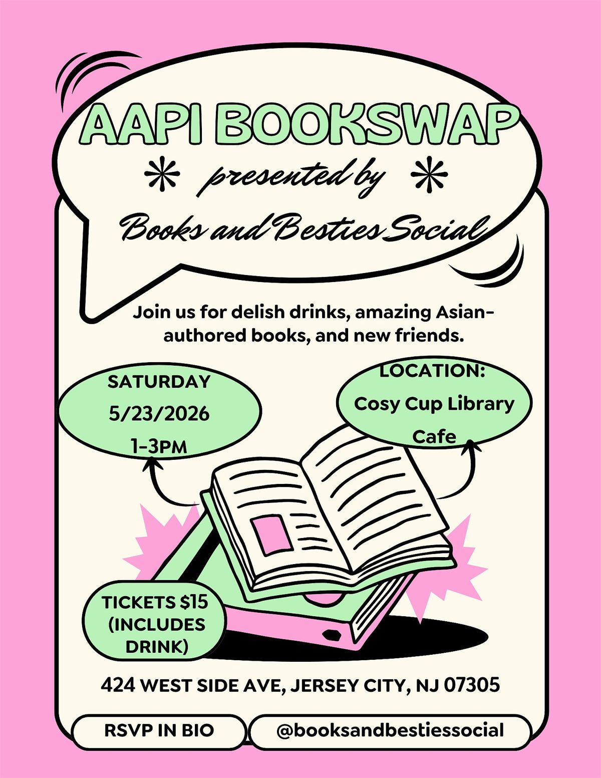Join Books & Besties Social for our first ever book swap in collaboration with Cosy Cup Library (café) and Jersey City resident bookfluencers, @bookaroundandfindout and @sharmaine.ong.writes!