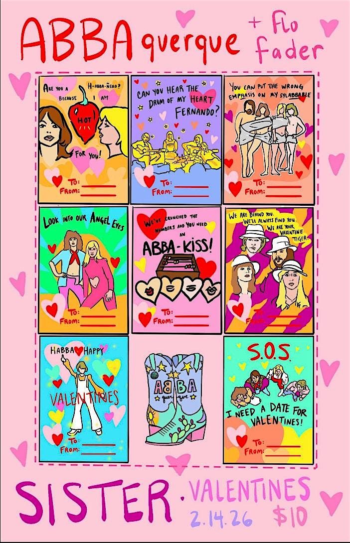 Join ABBAquerque and Flo Fader at Sister Bar on February 14th and be our Valentine! This is a great time to prioritize love and community and we wanna provide a space for it! Be your audacious loveable self and sing along with ABBA's romantic hits while taking pleasure in a Venn diagram of glitter and music! Bring your boo, your bestie or your own sweet self!