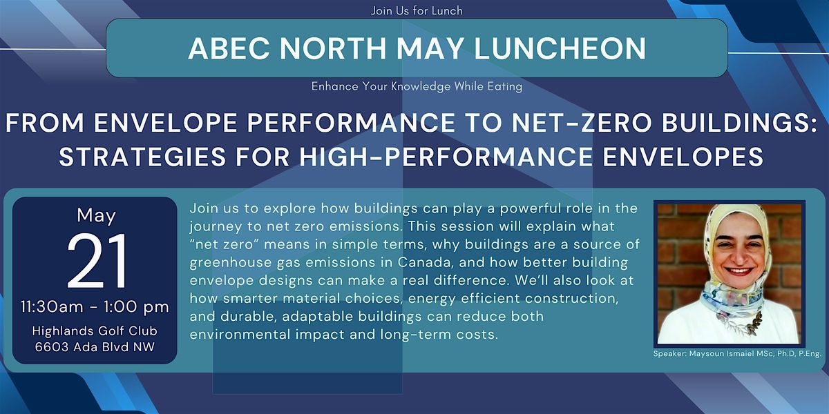 From Envelope Performance to Net-Zero Buildings: Strategies for High-Performance Envelopes. This month's luncheon will explore how buildings can play a powerful role in the journey to net zero emissions. This session will explain what “net zero” means in simple terms, why buildings are a source of greenhouse gas emissions in Canada, and how better building envelope designs can make a real difference. We’ll also look at how smarter material choices, energy efficient construction, and durable, adaptable buildings can reduce both environmental impact and long-term costs.