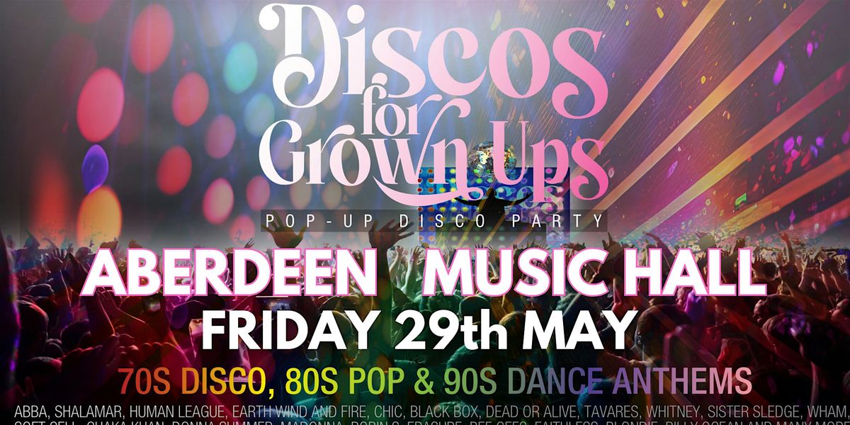 The legendary DISCOS FOR GROWN UPS 70s 80s 90s disco party is coming to TAberdeen Music Hall on Fridsy 29th March 2026 for an incredible boogie night to remember!