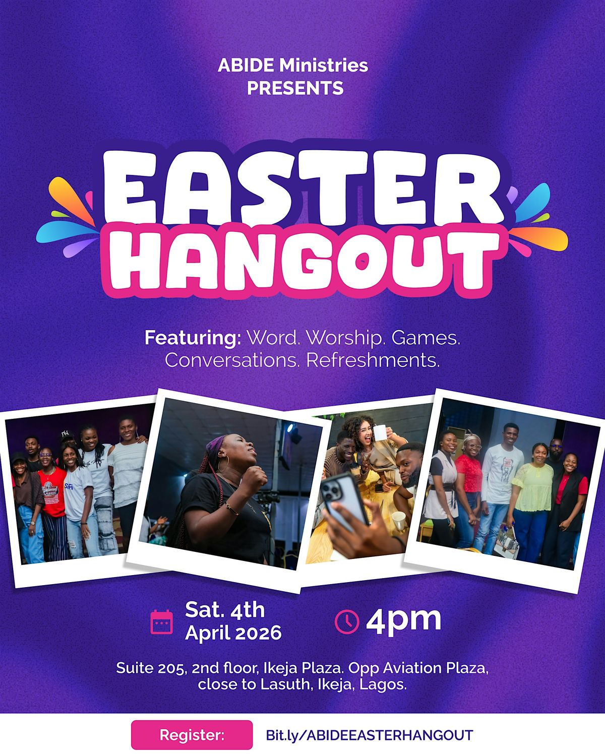 There would be games, refreshments and ofcourse discussions around the Bible. This is a great way to spend your Easter Saturday.