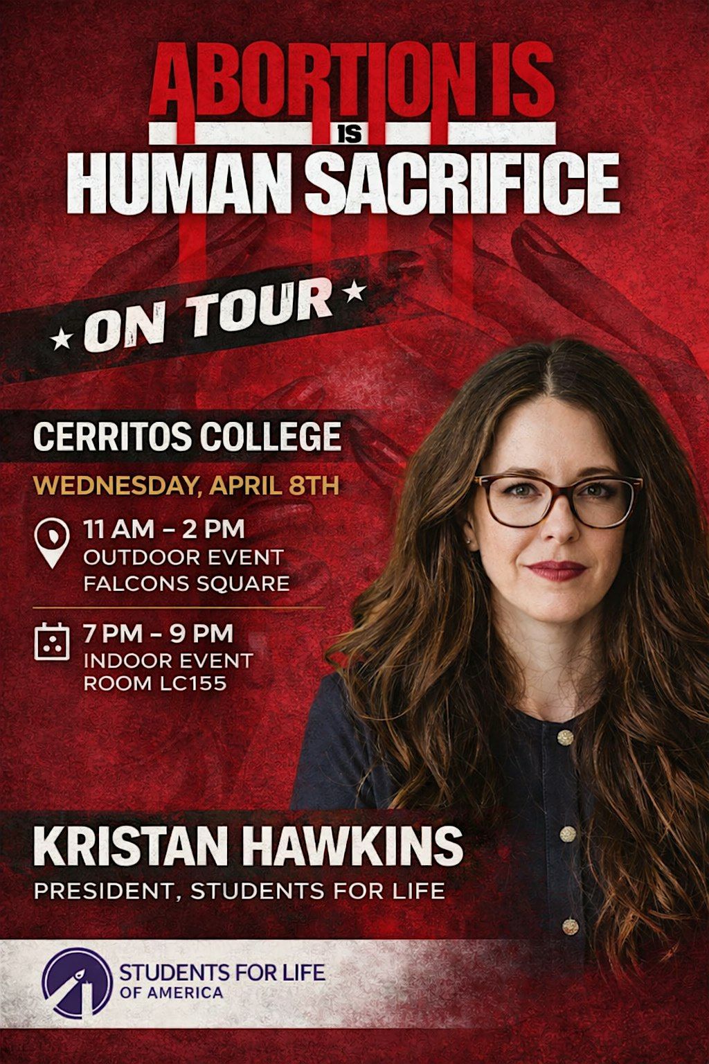 Kristan Hawkins, President of Students for Life of America, is coming to Cerritos College for a bold, unapologetic presentation on the reality of abortion.