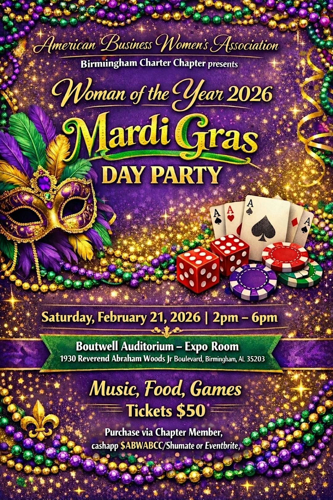 Welcome to the ABWA Birmingham Charter Chapter Mardi Gras Day Party! Get ready to celebrate with us at Boutwell Auditorium on February 21, 2026 at 2:00 PM (Central Time). It's going to be a blast! Don't miss out on the fun, music, and great company. Let's make unforgettable memories together. See you there!