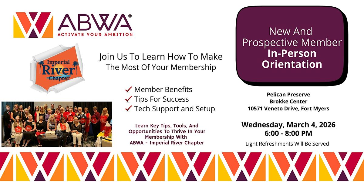 Are you new to the ABWA Imperial River Chapter? Are you interested in joining and want to learn more about how ABWA can help you grow as a business professional? Or are you a more seasoned member who would like a refresher on the many benefits available at the national and chapter level? Join us for a fun evening to learn about the American Business Women’s Association and how to make the most of your membership.
