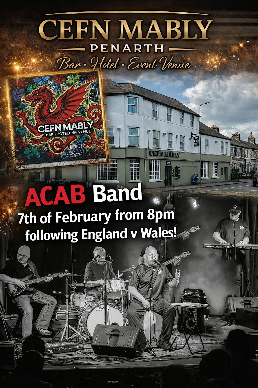 Get ready for an awesome night with ACAB Band rocking the stage in Penarth, Wales! This is an in-person gig, so come down, grab a drink, and enjoy some great tunes live at the Cefn Mably Bar, Hotel & Event Venue. Perfect spot to chill and catch some fantastic live music. Don’t miss out!
