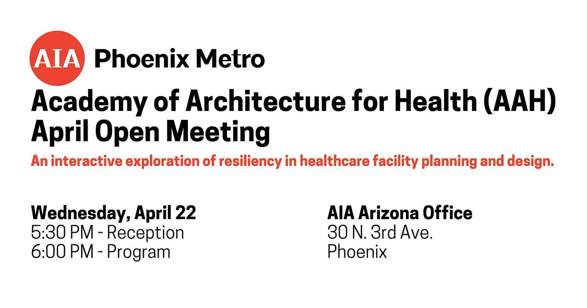 All are welcome to attend the AIA Phoenix Metro Academy of Architecture for Health (AAH) quarterly meeting on April 22 at the AIA Arizona office in Phoenix.