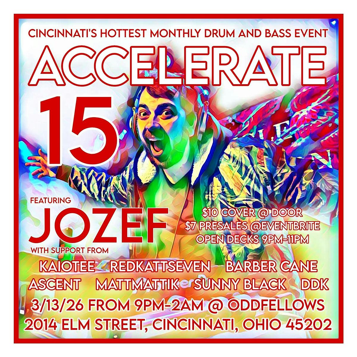 Oddfellows Liquor Bar, Subsonic Frequencies and Acclerate: Cincinnati Drum And Bass are proud to present Accelerate, the hottest monthly drum and bass event in Cincinnati, happening on the second Friday of every month. Our special featured guest DJ for the fifteenth edition of Accelerate is Jozef with support from Kaiotee, redkattseven, Ascent, Barber Cane, Mattmattik, Sunny Black and DDK