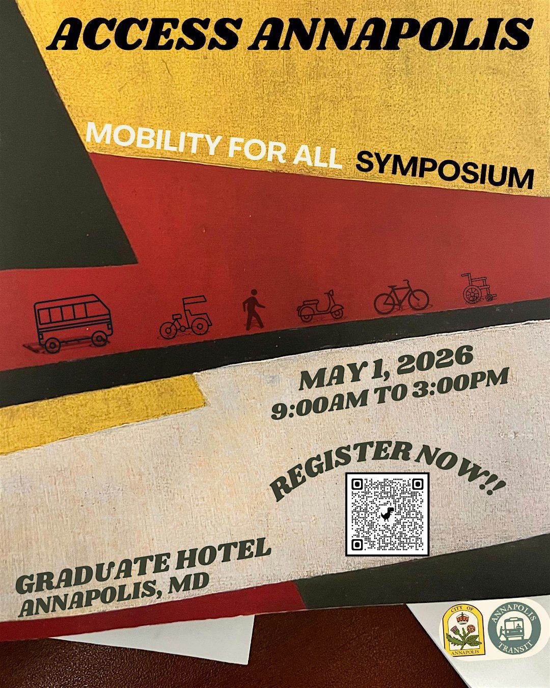 Welcome to the Access Annapolis: Mobility For All Symposium 2026! Join us at The Graduate Hotel on May 1, 2026, 2026 at 9:00 AM (Eastern Time) for a day filled with insightful discussions on enhancing mobility for everyone. Whether you're a community member, advocate, or policymaker, this event is for you! Let's come together to explore innovative solutions and create a more inclusive environment. Don't miss out on this opportunity to make a difference. See you there!