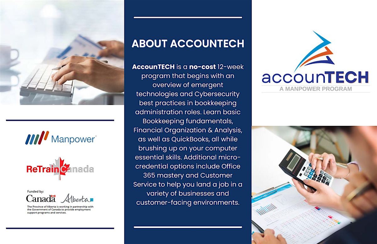AccounTECH is a FREE, government-funded training program designed to help job seekers transition into the bookkeeping and accounting field.