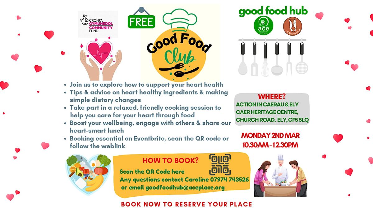 Welcome to our next Good Food Club event at CAER Heritage Centre! Join us for a fun session where you can try tasty dishes, share recipes and learn about all sorts of foods. This time, we’ll be looking at practical nutrition tips and simple dietary changes to support cardiovascular wellbeing. Together, we’ll explore how everyday ingredients can be transformed into meals that are good for your heart, great for your overall health, and still affordable and satisfying. After a fun, hands‑on cooking session, we’ll sit down to enjoy the delicious dishes we’ve made as a group. Information booklets are kindly being provided by British Heart Foundation. Spaces are limited, so make sure you secure your spot. And don’t forget — we’re starting at 10.30am.