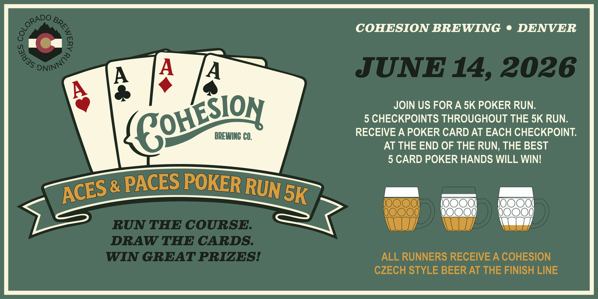 Join us for the Aces & Paces Poker Run 5k on June 14, 2026, for a 5k-ish, fun run event that starts and ends at Cohesion Brewing in Denver. Run, walk, jog - whatever goes! Complete the course and celebrate with us and a FREE, local craft brew or NA beverage at the finish line.