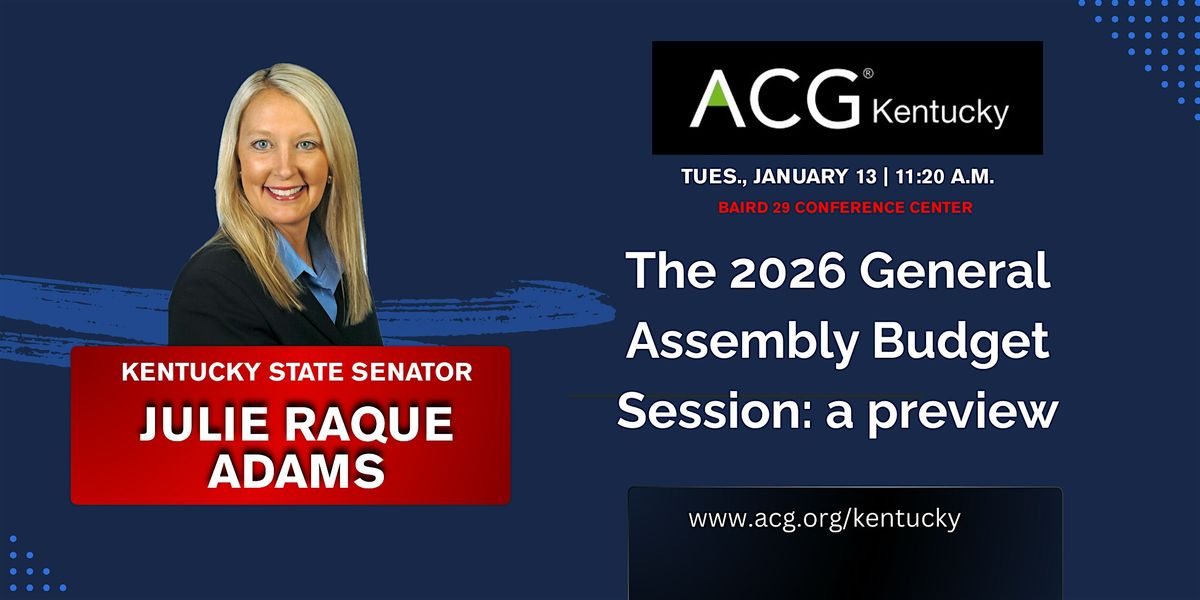 ACG Kentucky’s opening program for 2026 provides insights into the Kentucky State Legislature’s budget session. Kentucky State Senator Julie Raque Adams (R-36) provides her thoughts on potential issues and directions. Buffet lunch is included.