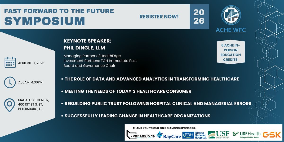 This 9-hour, instructor-led symposium will provide expert insight into a range of topics related to the future of healthcare. The panels will cover topics including how advanced analytics can improve care quality, safety, and cost, how consumer expectations are reshaping access and experience, how organizations rebuild public trust through transparent communication and stronger safety practices after errors, and how effective change leadership overcomes resistance to sustain major transformation. Attendees are welcome to ask questions and interact with panelists. Attendees will receive 6 hours of in-person ACHE credit and will have 4 hours to network with other healthcare professionals.