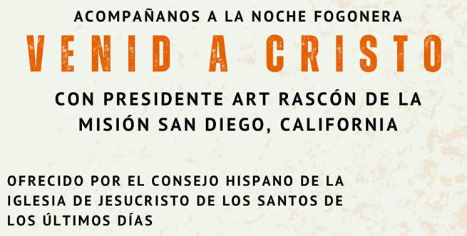 Acompanaños a la noche fogonera “Venid a Cristo” Con presidente Art Rascón de la Mission San Diego, California Ofrecido por el consejo hispano de la Iglesia de Jesuscristo de Los Santos de Los Últimos Días Para todos los adultos y jóvenes en español con interpretación al inglés “Imviten a sus amigos” “Habra refregerio”