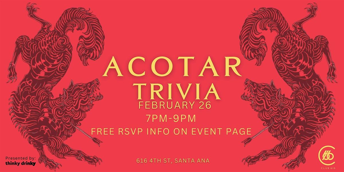 Gather your Inner Circle and prepare for an epic night of ACOTAR-themed trivia at Club 616 on February 26th from 7 PM - 9 PM, presented by the all-knowing minds at Thinky Drinky. Only the wisest of scholars, the cleverest of tricksters, and those who have whispered secrets to the Suriel will prevail.