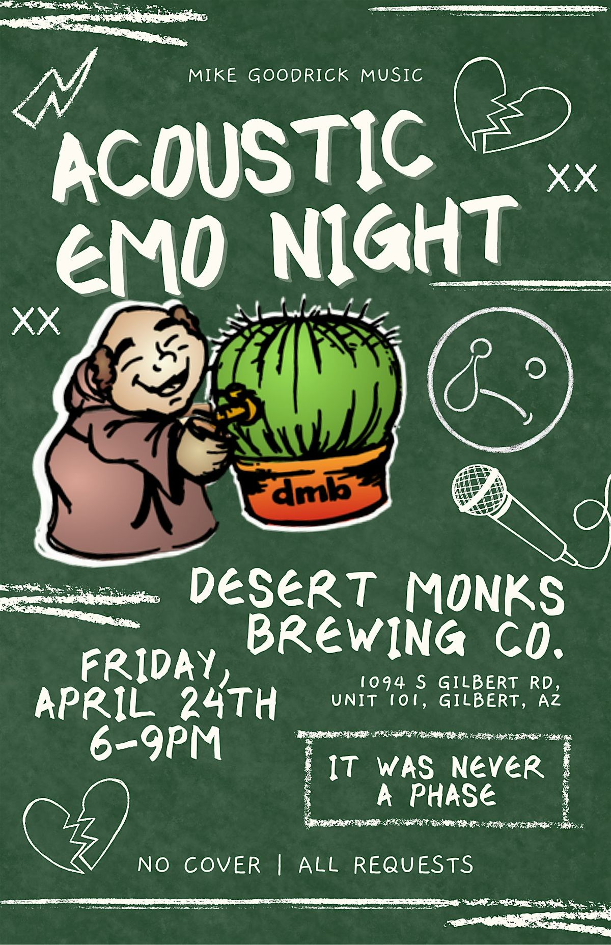 We are wrapping up an incredible month of emo nights with one last emotional bang! Catch Mike Goodrick at Desert Monks Brewing in Gilbert. Bring your friends, grab a pint of your favorite local brew, and get ready to sing along to the soundtrack of your youth. From the opening chords to the final chorus, it’s going to be a night full of memories, and maybe a few tears (the good kind). Let’s close out April the only way we know how—loudly and acoustically! No Cover, All Requests.