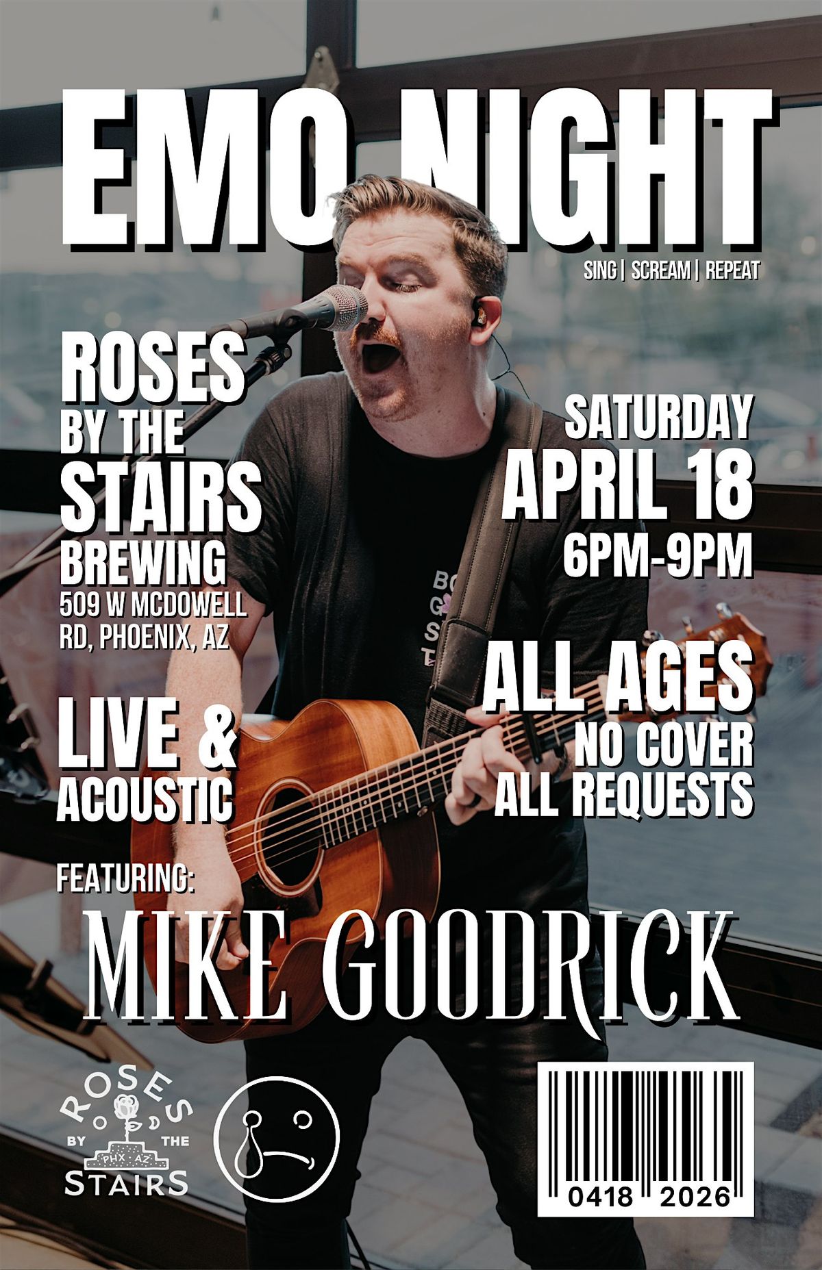 "I'm Not Okay!" The Acoustic Emo Night returns to one of Phoenix's coolest spots, Roses By The Stairs Brewing. Come hang out with Mike Goodrick for an evening dedicated to the best 00s emo and pop-punk covers. Whether you're a die-hard fan of MCR and Paramore or you just want to vibe out to some acoustic jams, this is the place to be. The beer is cold and the vibes are immaculate. Don't miss out on what is always a packed and high-energy night!