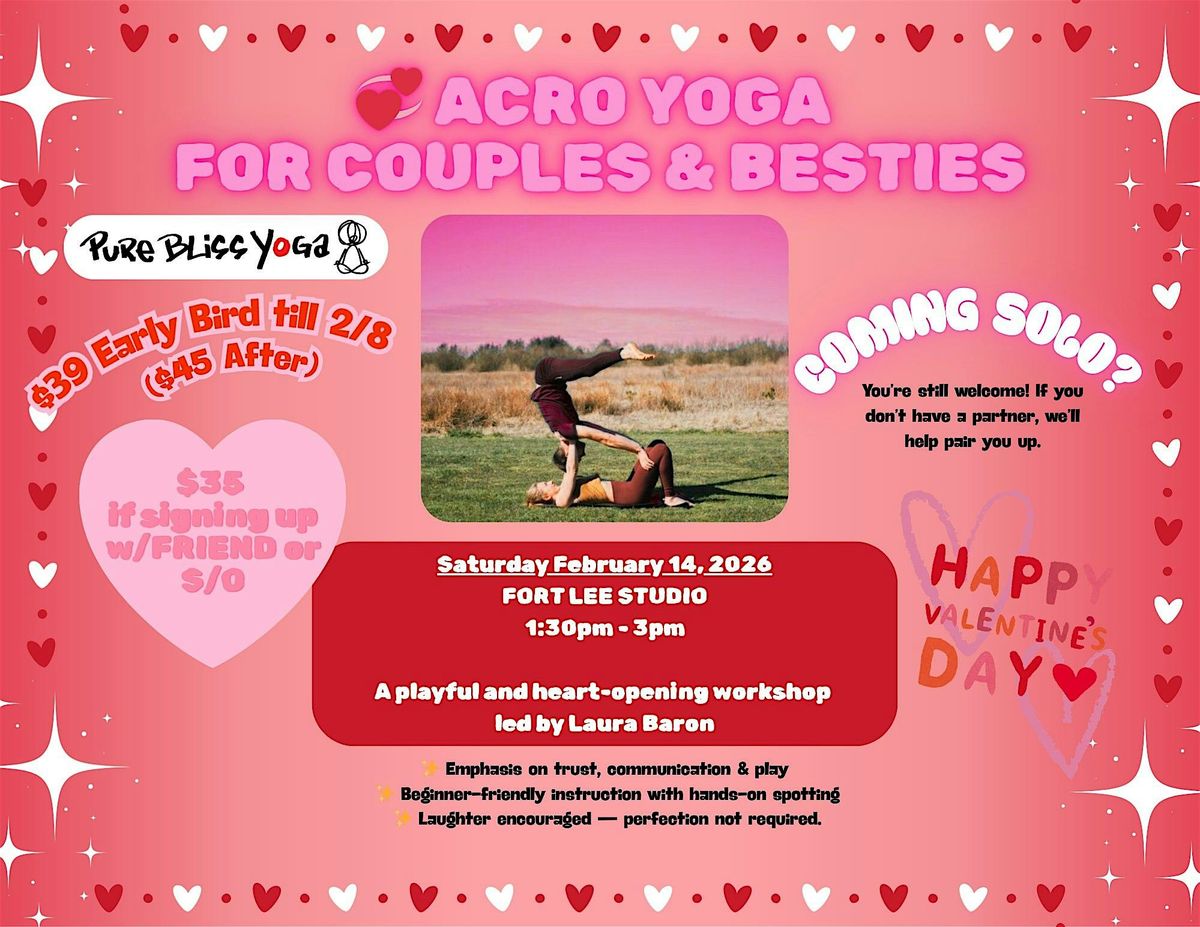 Celebrate connection, laughter, and trust this Valentine’s Day with Acro Yoga for Couples & Besties, a playful and heart-opening workshop led by Laura Baron at our Fort Lee studio. This experience is designed especially for beginners, so no prior acro or yoga experience is needed — just a willingness to try something new together.
