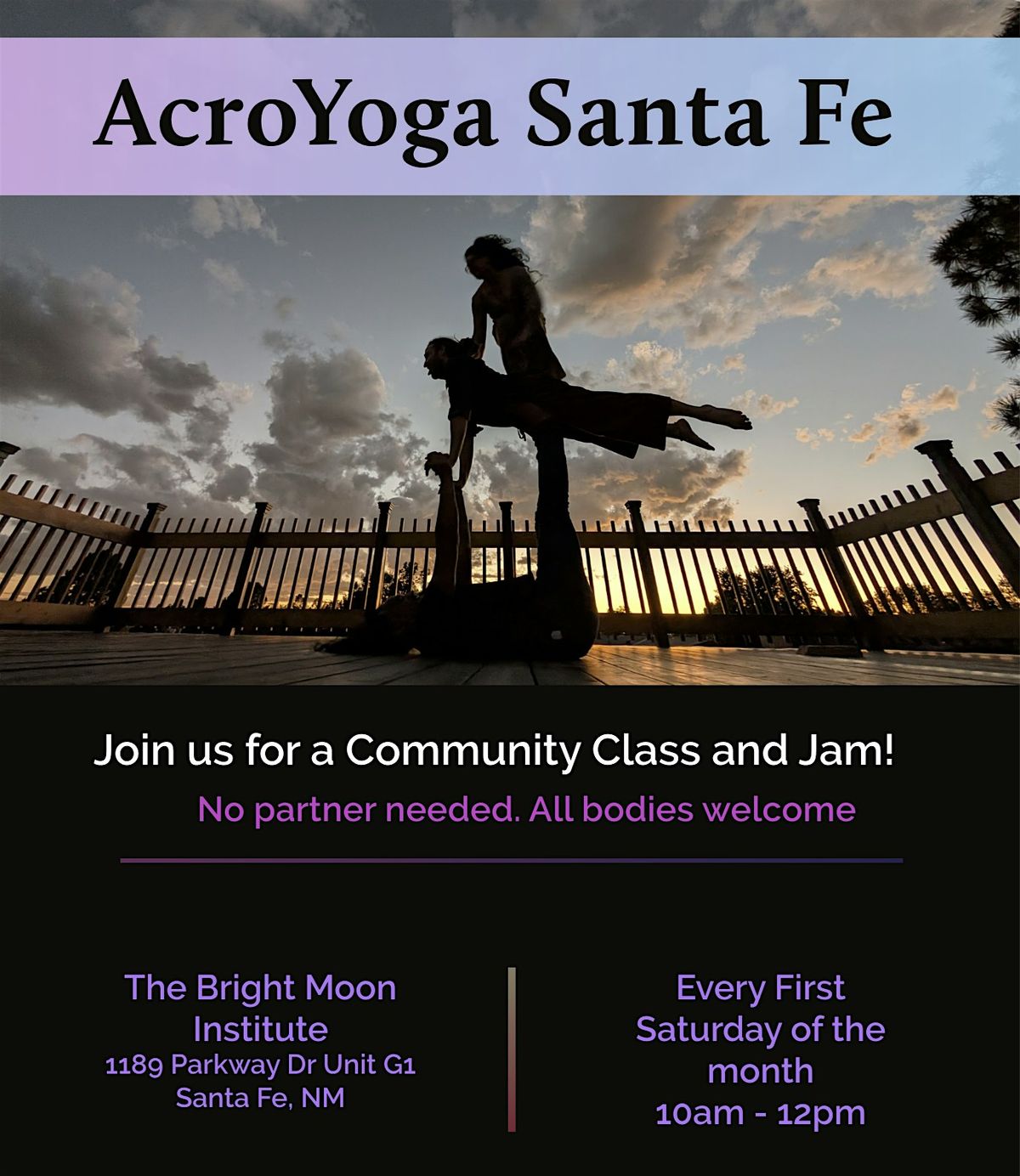 Join us in person for a fun and friendly AcroYoga community class and jam held every 1st Saturday of the month at The Bright Moon Institute. Whether you’re a newbie or a pro, this welcoming gathering is the perfect spot to connect, practice, and play. Bring your friends, an open mind, and get ready to explore balance, trust, and awesome moves together. No pressure, just good vibes and plenty of laughs! No partner needed. All bodies welcome. $25.