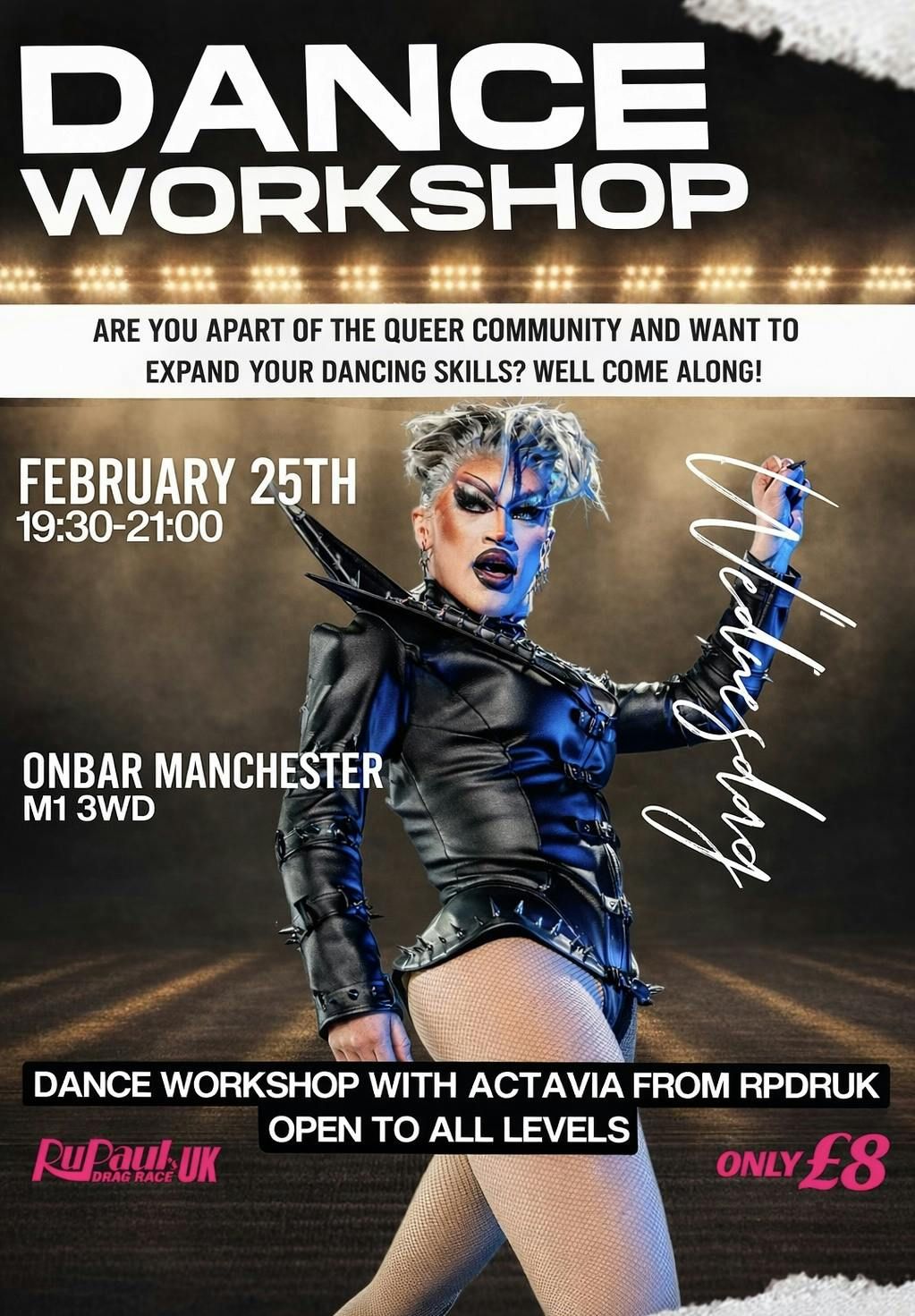 Actavia’s Dance Workshop:Come and join me (Actavia from Rupaul’s Drag Race UK) for a dance workshop that is open for all queer people (and ally’s) and queer performers. This dance workshop will be an open supportive space to learn something new, meet and socialise with others, and of course of loads of fun!