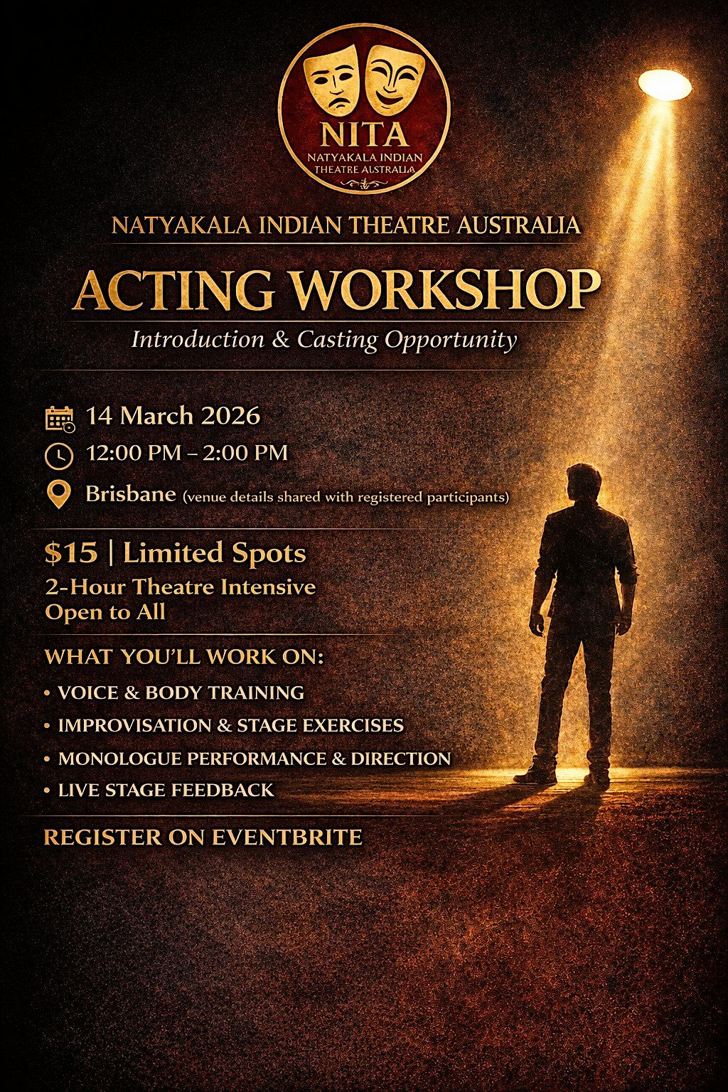 Natyakala Indian Theatre Australia (NITA) invites you to a 2-hour interactive acting workshop in Brisbane. This session is open to anyone curious about theatre — whether you are completely new or have prior stage experience.