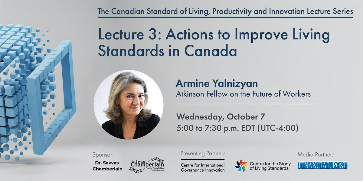 The third lecture of The Canadian Standard of Living, Productivity and Innovation series will be presented by Armine Yalnizyan, Canadian economist and Atkinson Fellow on the Future of Workers. She will explore how factors such as technological innovation and social challenges, like inequality, are shaping Canada’s approach to building long-term productivity, growth and prosperity.