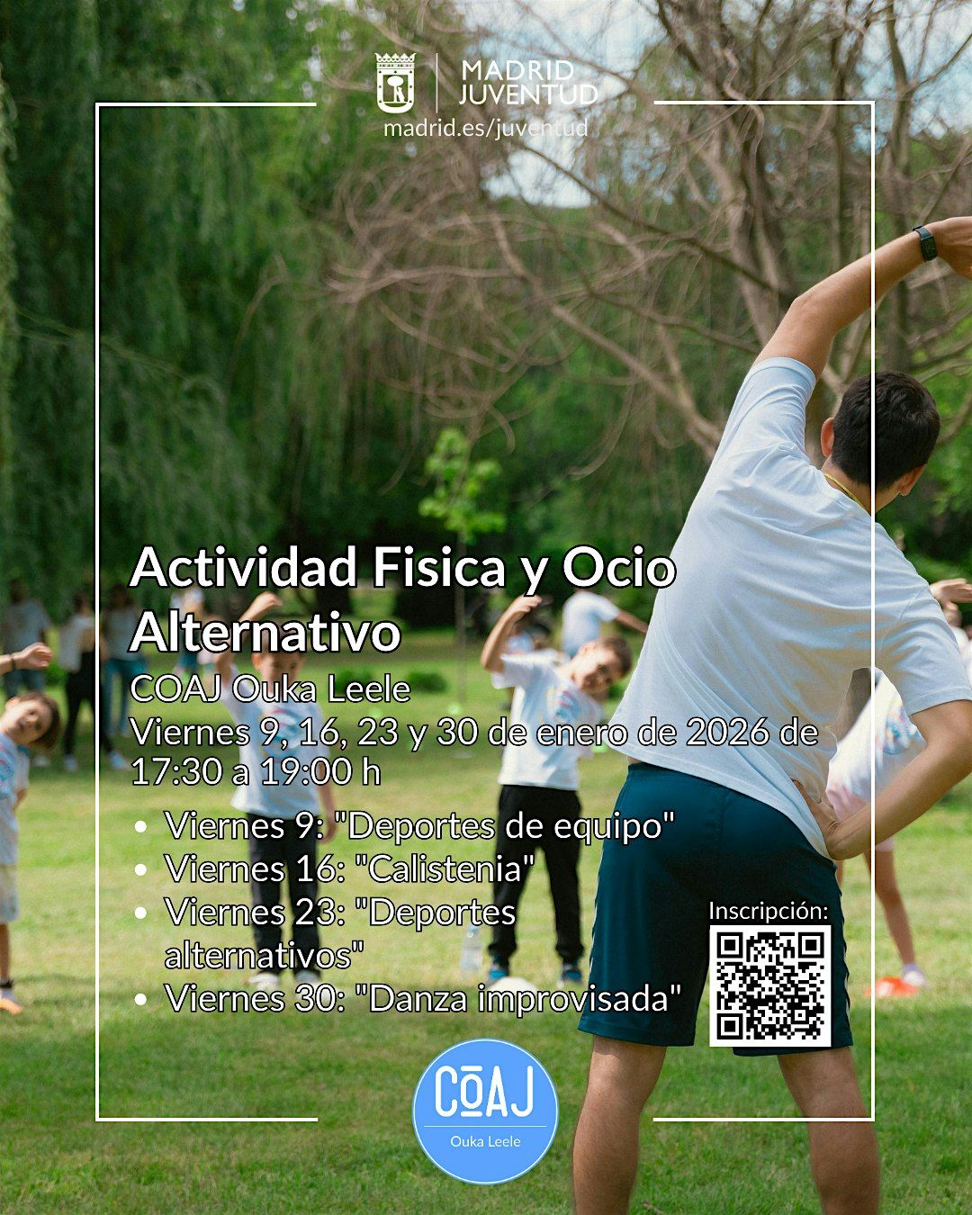 ¿Quieres disfrutar de tu tiempo libre cuidando el cuerpo de una forma nueva y creativa? ¡Únete con Madrid Salud! Combinamos actividad física al aire libre en un espacio urbano, con movimiento expresivo e improvisación en sala. Una experiencia única para moverte, relajarte y sentirte genial. ¡Te esperamos cada semana para ponerte en forma mientras te diviertes!