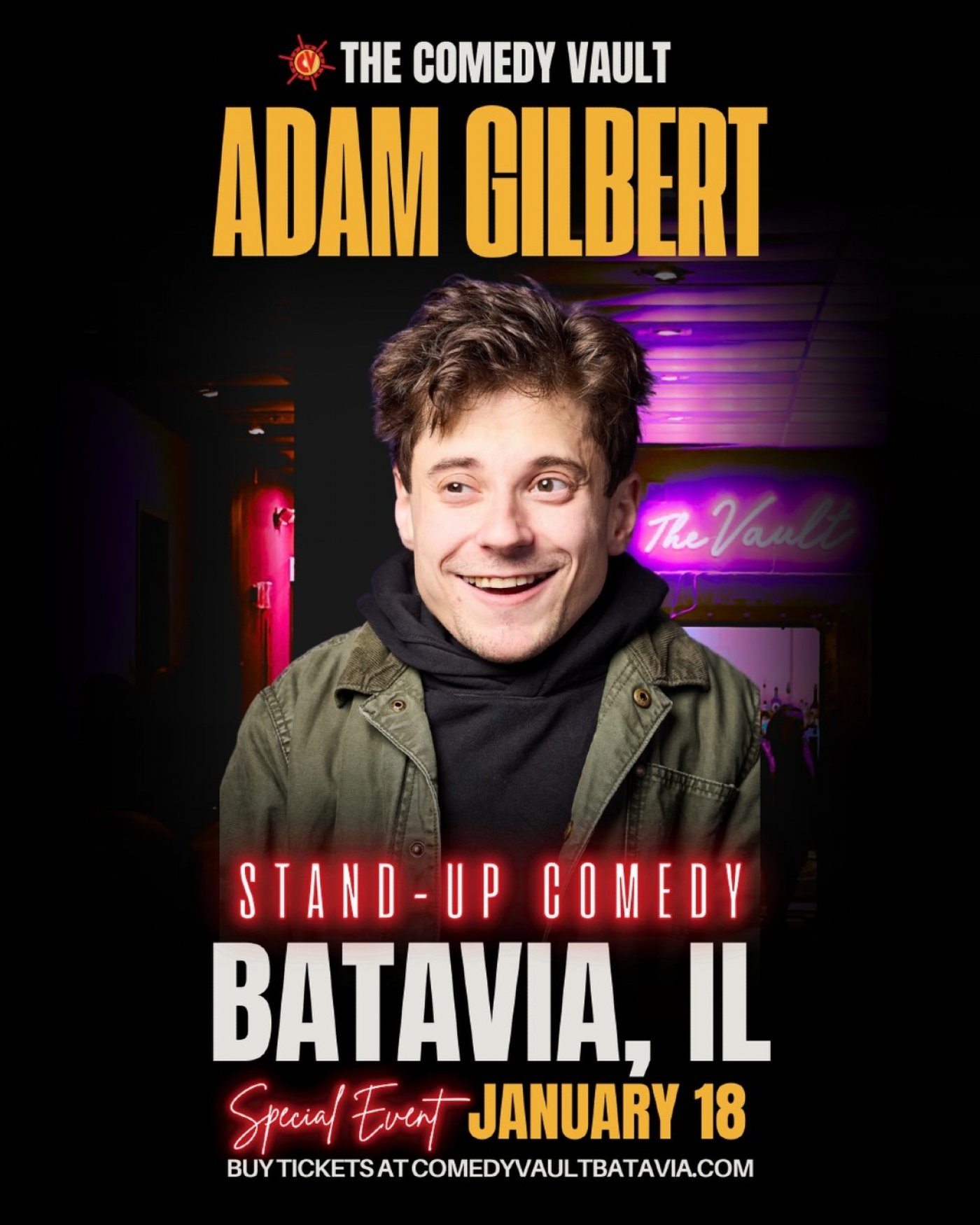 See Adam Gilbert LIVE at The Comedy Vault in Batavia. One night only- Sunday January 18th!
