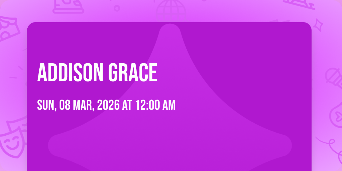 ? Location: 40.7109, -73.9366? Welcome to Addison Grace, where dreams come alive and possibilities are endless! ?️ Join us at The Meadows - Brooklyn in the heart of Brooklyn, NY for an event that defies expectations. ? On March 8th, 2026 at 12:00 AM, be part of something truly extraordinary as we bring together innovation, entertainment, and pure magic. ✨ Every aspect has been carefully designed to ensure an unforgettable experience for all our guests. Whether you're seeking adventure, inspiration, or simply a break from the ordinary, this event promises to deliver beyond your wildest dreams. ? Prepare for a journey into the extraordinary!