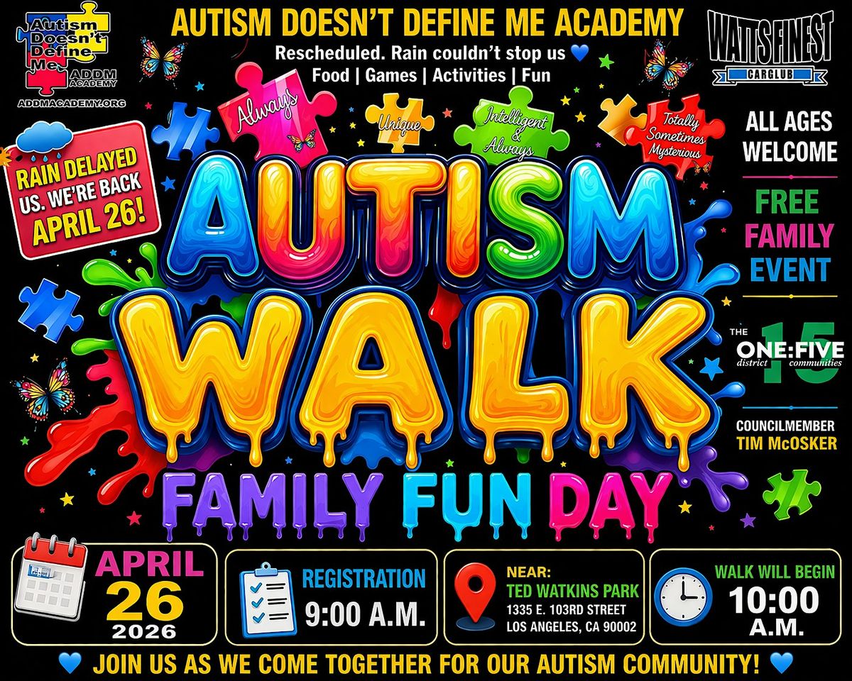 Join us for the Autism Walk Family Fun Day hosted by Autism Doesn’t Define Me Academy on April 26, 2026 at Ted Watkins Park in Los Angeles.