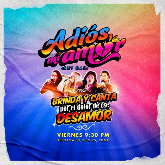 Qué vas a disfrutar 🎙️ Show con voces que te harán recordar los momentos más vibrantes de la música y DJ set en vivo 👀 Disfruta de gran cercanía al show, con la mejor vista al escenario y una experiencia totalmente inmersiva 🍽️ Vive la velada perfecta con alimentos y bebidas de calidad 5 estrellas a cargo de Fiesta Americana (bebidas y alimentos NO incluidos en el boleto) Información 📅 Fechas: Selecciona la fecha que quieras directamente en el selector de boletos 📍 Lugar: Stelaris Foro Reforma – CDMX 🕒 Horario: apertura de puertas 21:30 h · Show 22:30 h · DJ a partir de las 00:00 h ⏳ Duración: 2 horas de show + 1 hora de servicio de alimentos + 3 horas de DJ 👤 Edad: a partir de 15 años ♿ Accesibilidad: experiencia accesible para personas con movilidad reducida con previo aviso 🎟️ La entrada incluye únicamente el acceso a la experiencia ❓ Puedes consultar las preguntas frecuentes y sus respuestas aquí Descripción ¡Convierte el despecho en una noche inolvidable con Adiós, Mi Amor! Cada viernes, el Sky Bar de Stelaris se llena de emociones y buena música para liberar penas cantando a todo pulmón. Empieza con un karaoke vibrante entre amigos, sigue con tres segmentos de cantantes en vivo que encenderán el alma, y acaba bailando sin parar con un DJ en directo desde lo alto de Reforma 80. Y para completar la noche, disfruta de deliciosos cócteles de autor y una oferta gastronómica de primer nivel en un ambiente único. ¡Ven a cantar, reír, brindar y soltar! Porque si se va el amor… ¡que se quede la fiesta!