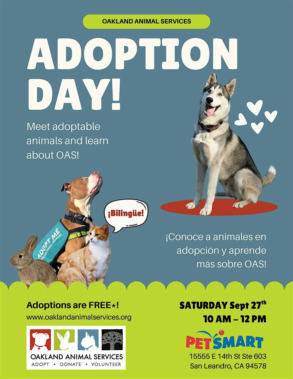 ¡Acompáñanos a este evento de adopción de Oakland Animal Services en PetSmart San Leandro! Conoce perros, gatos y conejos en adopción.