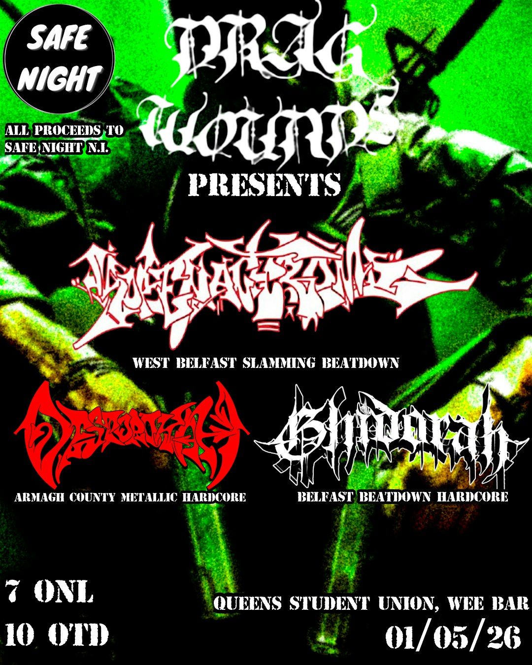 Adrenachrome, Ghidorah and Destroyah throw a mad one in the Students Union. All proceeds to Safe Night NI.