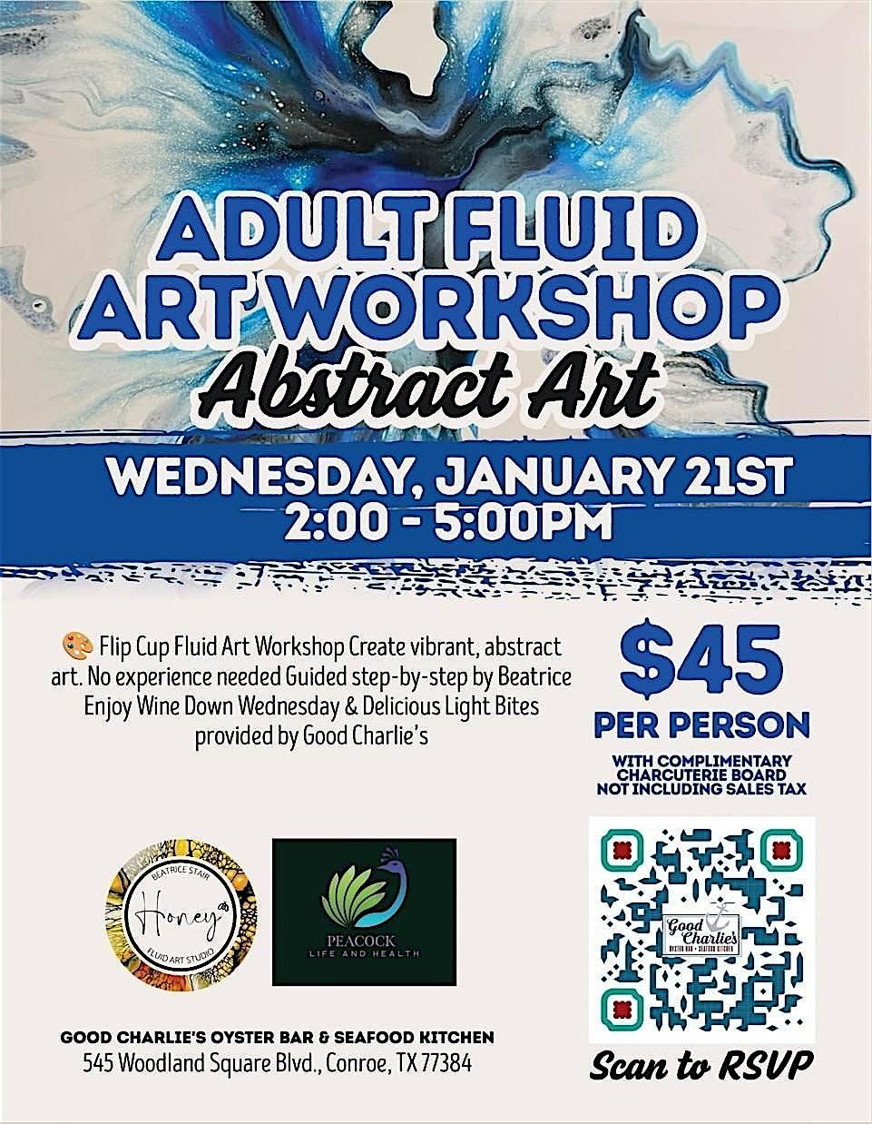 Join us for a super fun in-person Adult Fluid Art Workshop! Dive into the colorful world of fluid painting and create your own unique masterpiece. No experience needed—just bring your creativity and a splash of adventure. We’ll guide you step-by-step while you mix, pour, and swirl vibrant paints to make stunning art. Come hang out, relax, and let your artistic side flow ! Purchase tickets via QR Code or this linkL https://www.exploretock.com/good-charlies-conroe/event/580340