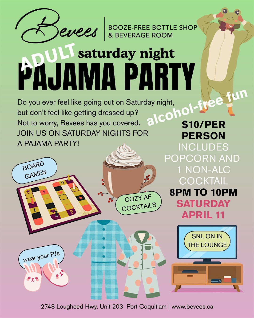 Get ready for a chill night at Bevees Booze-Free Bottle Shop & Beverage Room! Bring your comfiest pajamas and hang out with fellow adults who love a good non-alcoholic vibe. We'll kick things off on April 11, 2026 at 8:00 PM (Pacific Time). It’s all about good company, cozy vibes, and tasty booze-free drinks. Don’t miss out on this fun, laid-back evening!