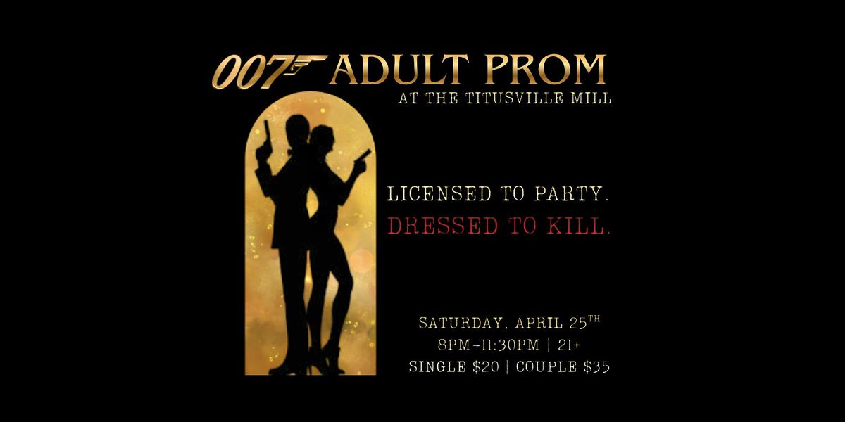 Join us Saturday, April 25 from 8:00–11:30 PM for 007 Adult Prom, a night of tuxedos, evening gowns, cocktails, and dancing inspired by the legendary world of James Bond.