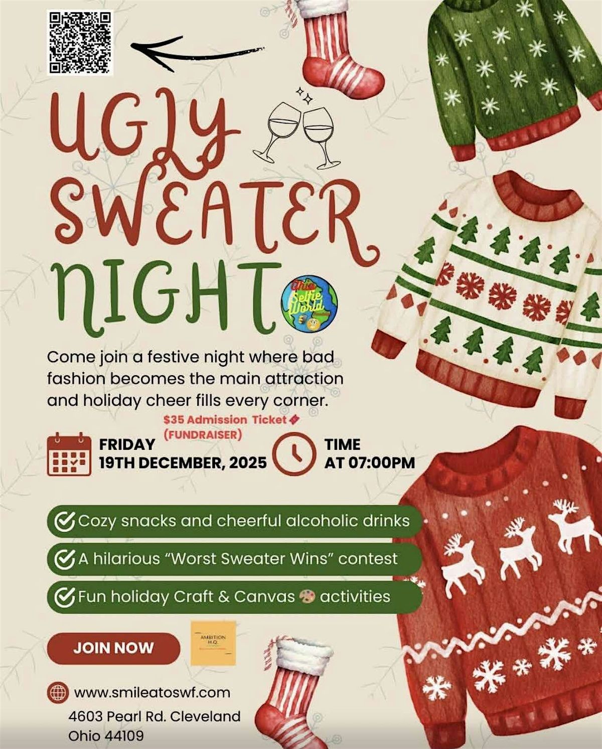Get ready for a night of fun, laughs, and creative chaos! Join us in person to paint, sip, and flaunt your ugliest holiday sweater. It’s the perfect way to let loose and support a great cause. Bring your friends, grab a drink, and unleash your inner artist while rocking those hideous sweaters! this is just for $35.