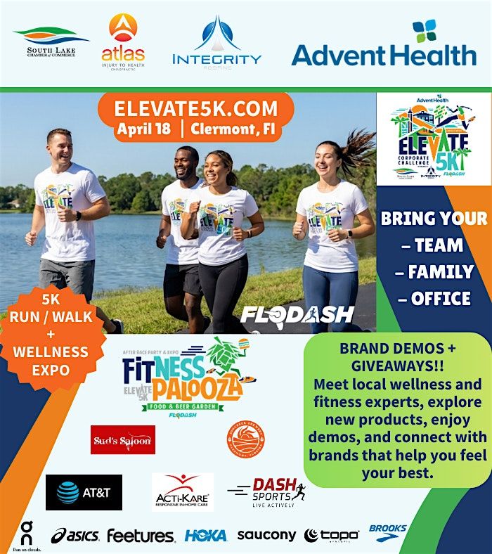 Come early and start your morning with the AdventHealth Elevate 5K Corporate Challenge presented by Integrity Roofing at 8:00 AM. The 5K is a paid event and registration is available at . You can run, walk, or cheer — then stay and enjoy FitnessPalooza afterwards from 9:00 AM – 12:00 PM.