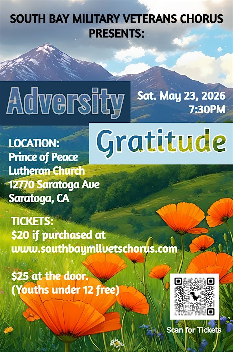 Come join us for an evening filled with music and inspiration at the Prince of Peace Lutheran Church. The South Bay Veterans Chorus will be performing a special concert titled "Adversity and Gratitude". Let's celebrate the resilience and gratitude of our veterans through the power of song, exploring gospel, spirituals and chorale singing. Mark your calendars and be part of this unforgettable experience!