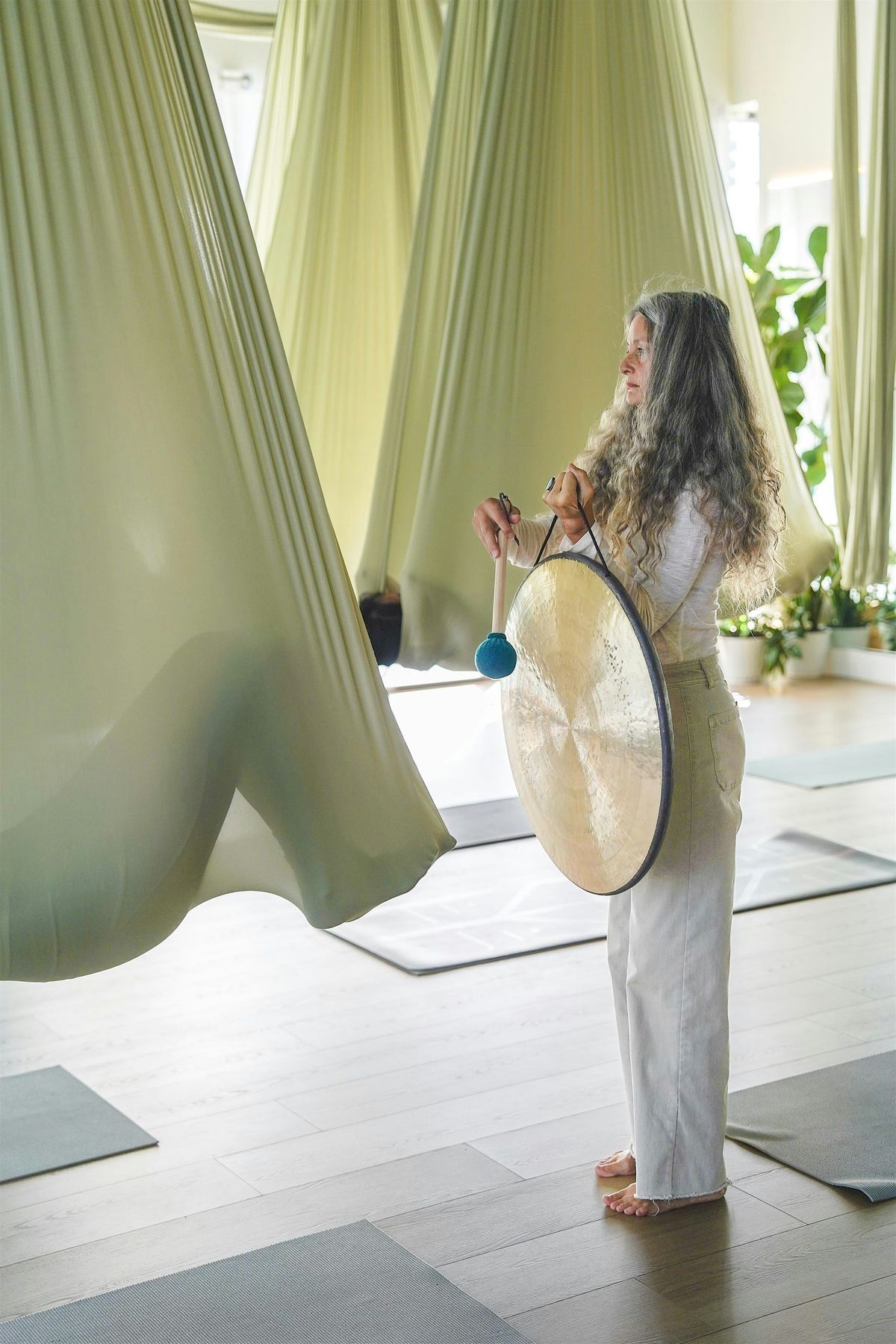 Lead by instructor Wenwen and Leah, the session begins with slow, supported stretches in the aerial hammock to open the shoulders, spine, and hips. As your body softens, you’ll transition into a restful position, allowing the hammock to fully support you. From there, you’ll be guided into a sound healing journey, where you can simply lie back, relax, and receive.