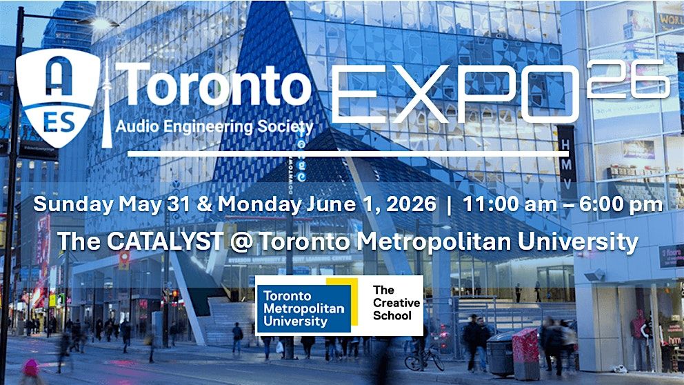 Toronto AES EXPO26 is a 2-day audio technology expo taking place on Sunday May 31 and Monday, June 1, 2026, from 11:00 am to 7:00 PM at The Creative School @Toronto Metropolitan University, Toronto, Ontario. Toronto AES EXPO26 brings together audio manufacturers, distributors, retailers, designers, innovators, and evangelists who are shaping the future of audio technology.