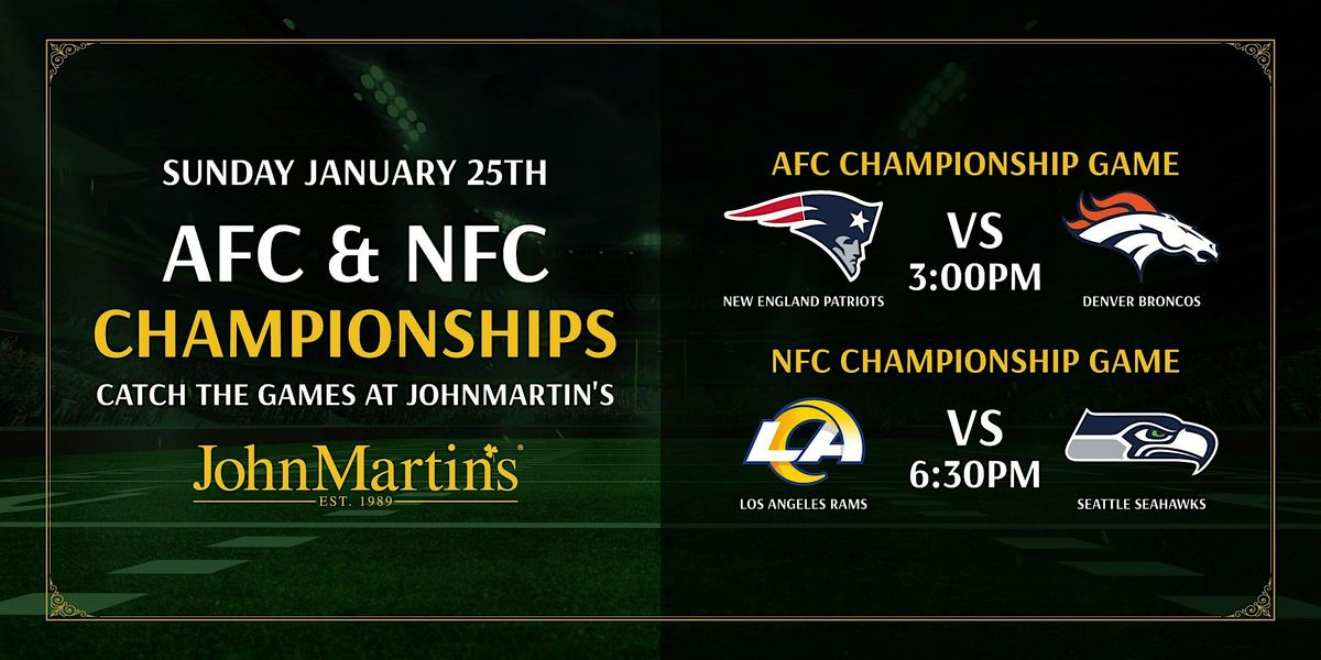 Football fans, this is the big one. Join us at JohnMartin’s for an epic NFL Championship Sunday as we show both the AFC and NFC Championship Games live on our screens.