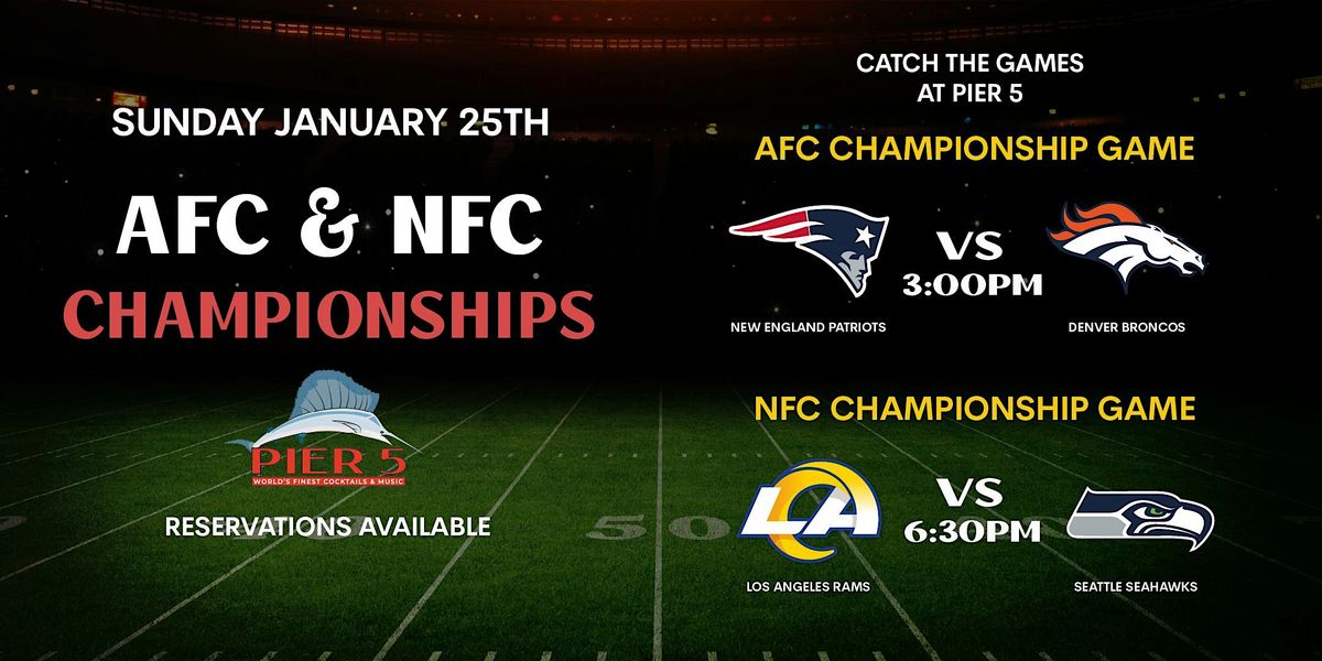 Catch Championship Sunday in style at Pier 5 – World’s Finest Cocktails & Music. Join us for an all-day football experience as we show both the AFC and NFC Championship Games live on our screens in a high-energy waterfront setting.