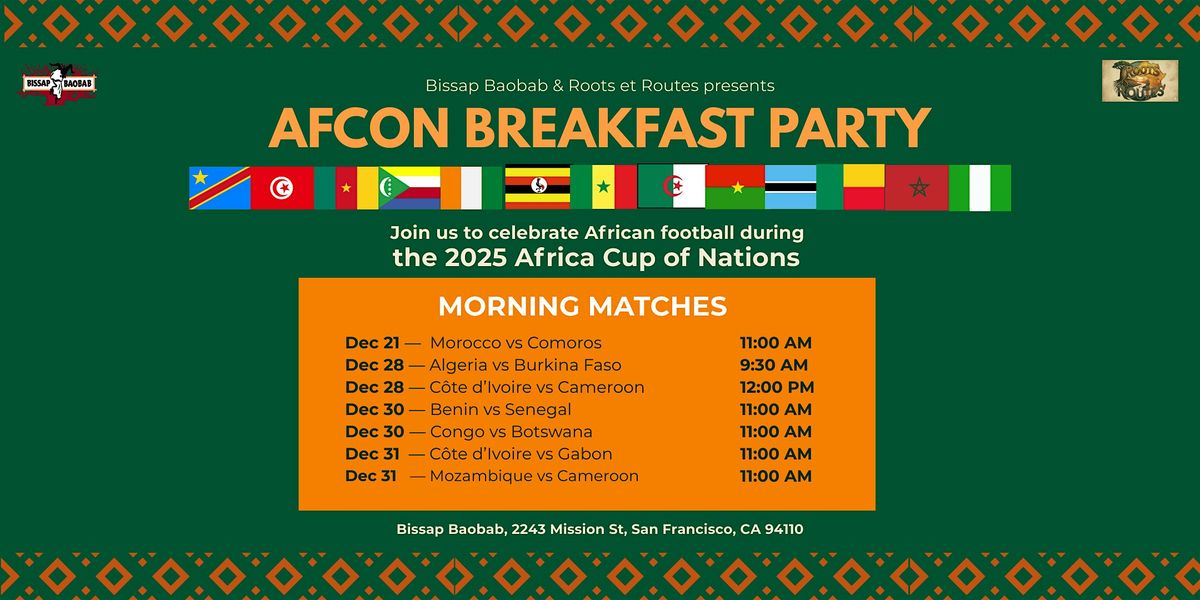 Starting December 21, join us at Bissap Baobab for breakfast and live match screenings of the African Cup of Nations! We're turning the Mission into your AFCON home base — full of spirit, flavor, and football.