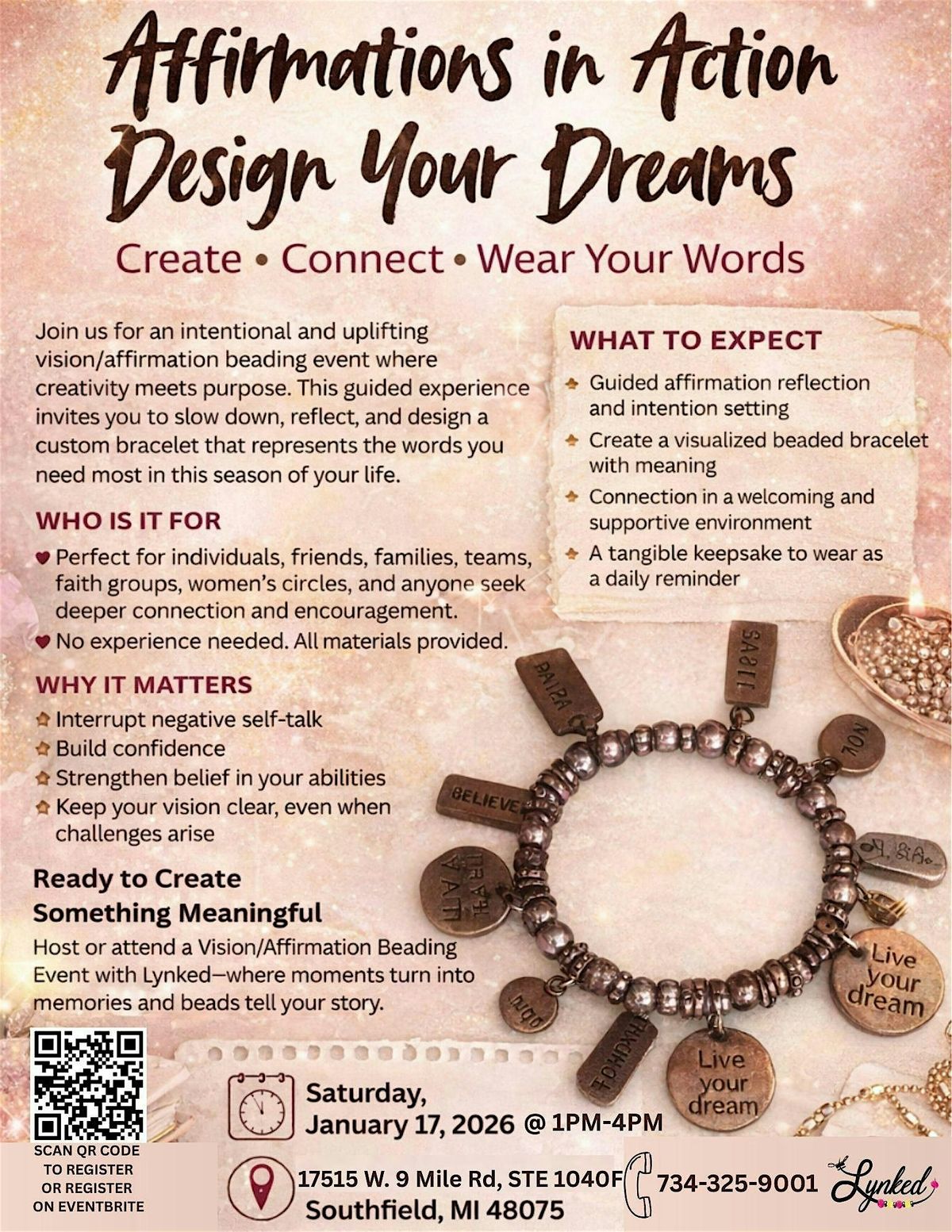 Join us for Affirmations in Action: Design Your Dreams—a guided vision and affirmation bracelet experience where purpose meets creativity.