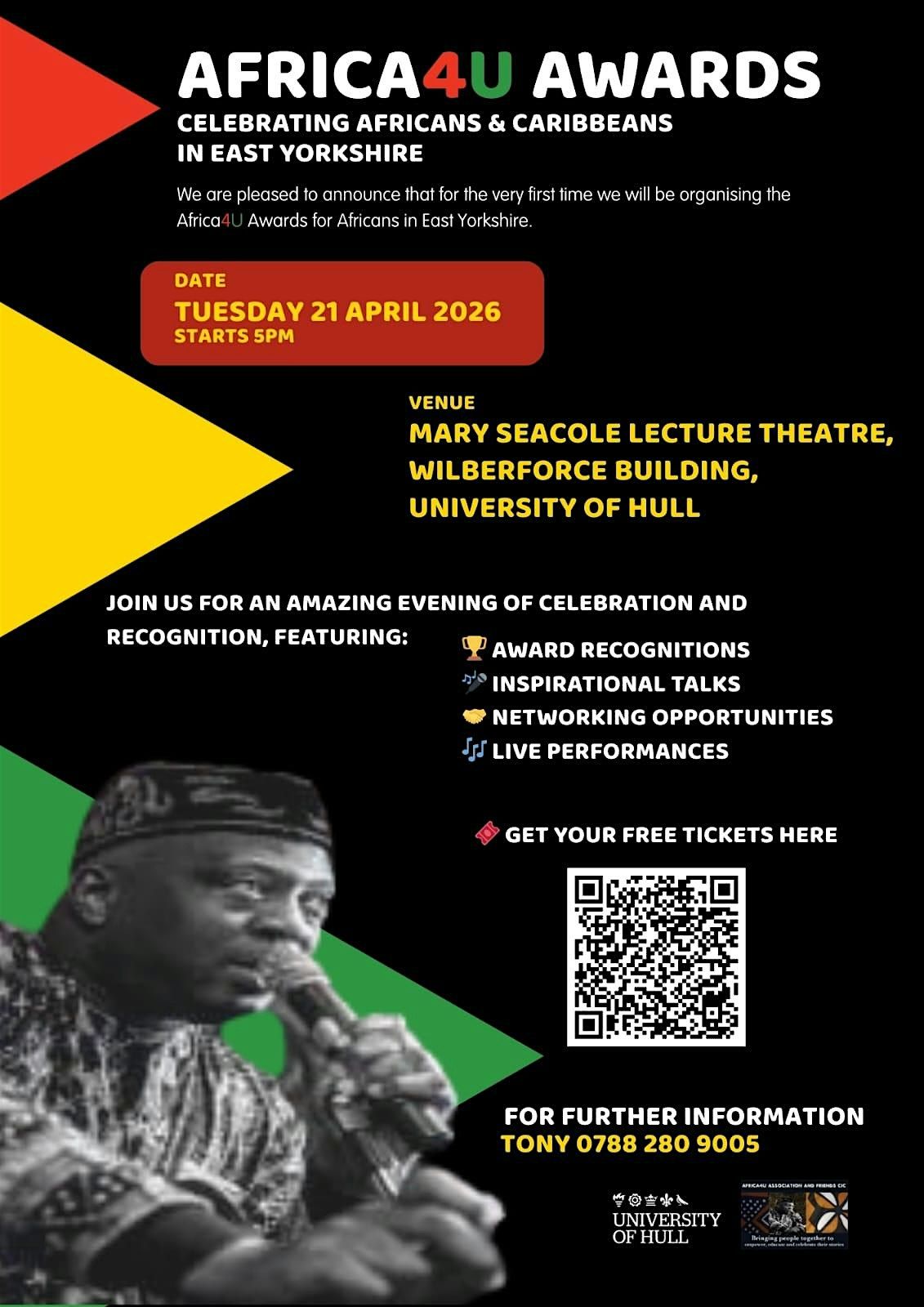 AFRICA4U AND FRIENDS CIC will be organising THE VERY FIRST EVER Africa4u Awards for Africans in EAST YORKSHIRE taking place at The MARY SEACOLE LECTURE THEATRE, WILBERFORCE BUILDING, THE UNIVERSITY OF HULL, HULL , EAST YORKSHIRE