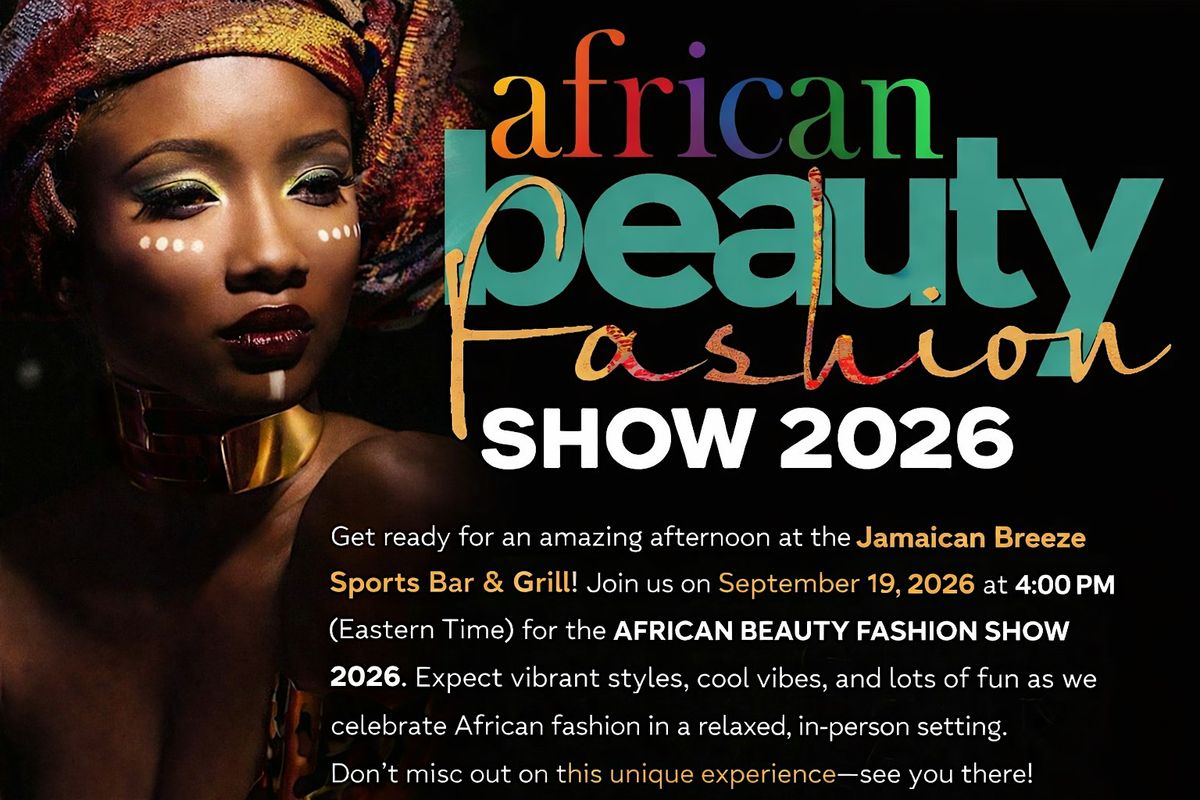 Get ready for an amazing afternoon at the Jamaican Breeze Sports Bar & Grill! Join us on September 19, 2026 at 4:00 PM (Eastern Time) for the AFRICAN BEAUTY FASHION SHOW 2026. Expect vibrant styles, cool vibes, and lots of fun as we celebrate African fashion in a relaxed, in-person setting. Don’t miss out on this unique experience—see you there!