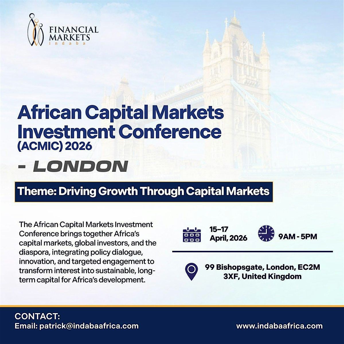 The African Capital Markets Investment Conference (ACMIC), will be held in London from 15th – 17th of April, and is designed to further amplify Africa’s capital market proposition by establishing a high-level platform that brings together African stock exchanges, regulators, listed companies, and market intermediaries with Development Finance Institutions (DFIs), global institutional investors, UK and European capital market peers, and the African diaspora investment community.